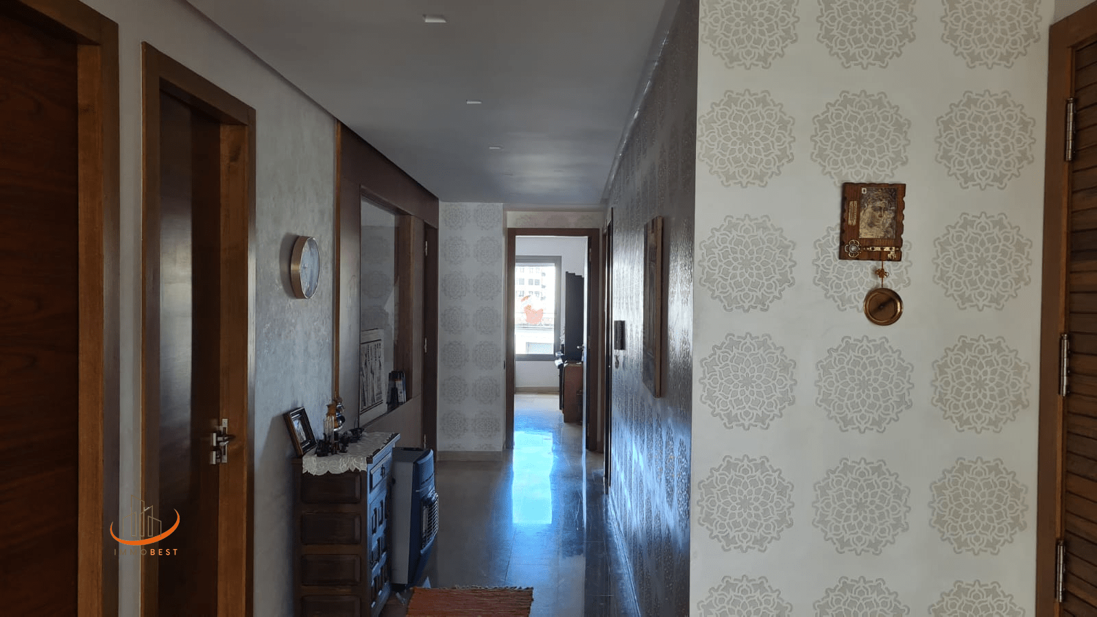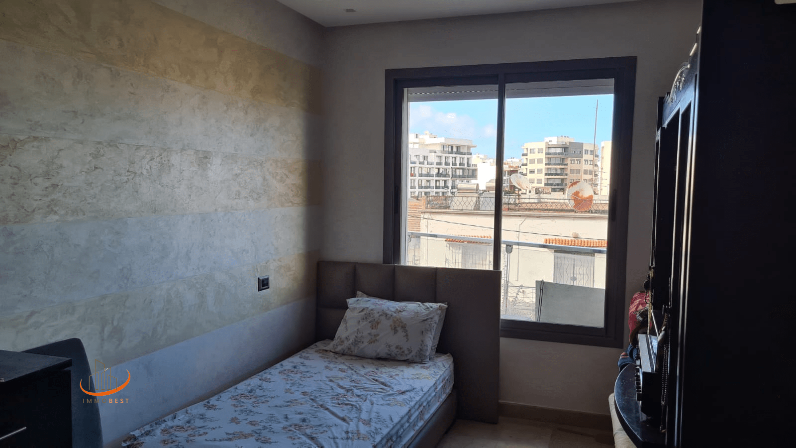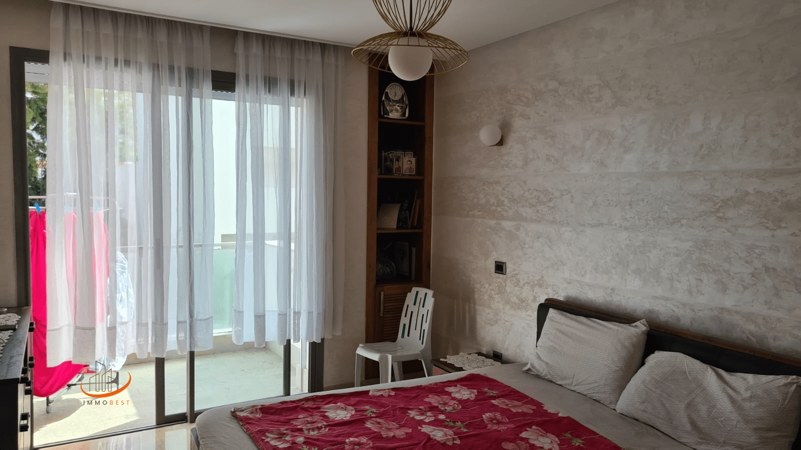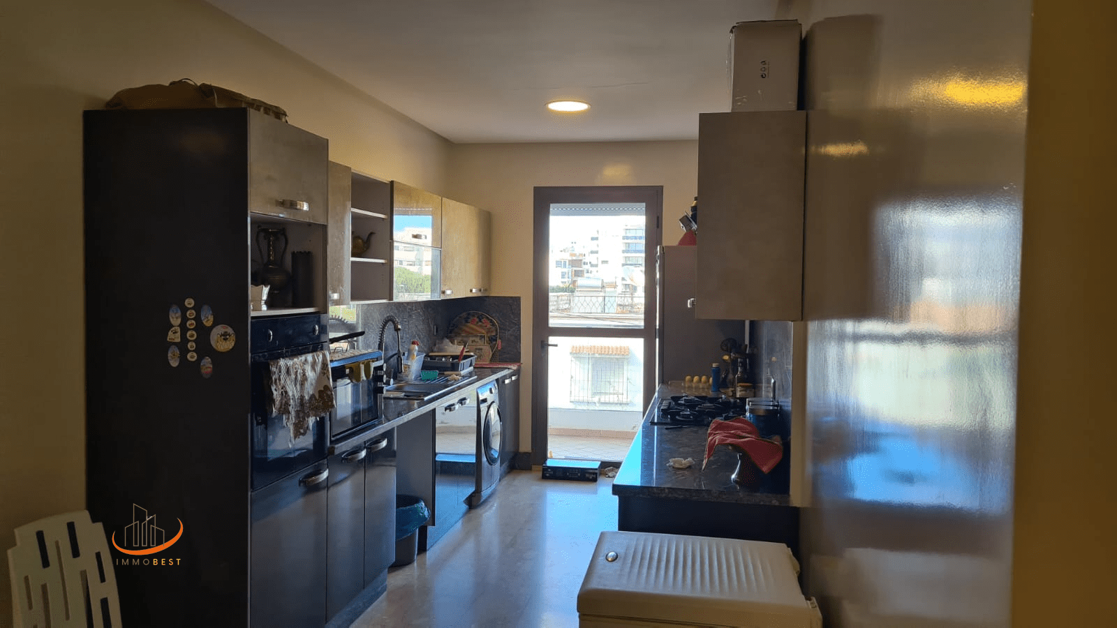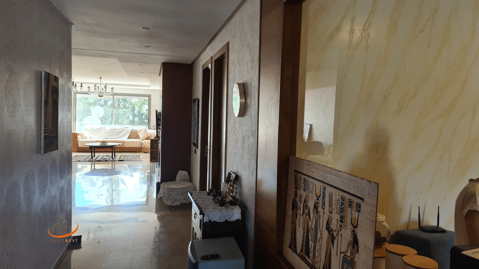 Situé au 1er étage. Quartier calme et proche de la mosquée, tramway et pleins de commodités. Place de parking au garage. Très bon standing.